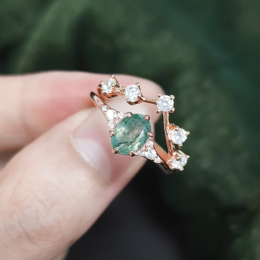 Oval Moss Agate Three Stones Engagement Ring Set 2pcs