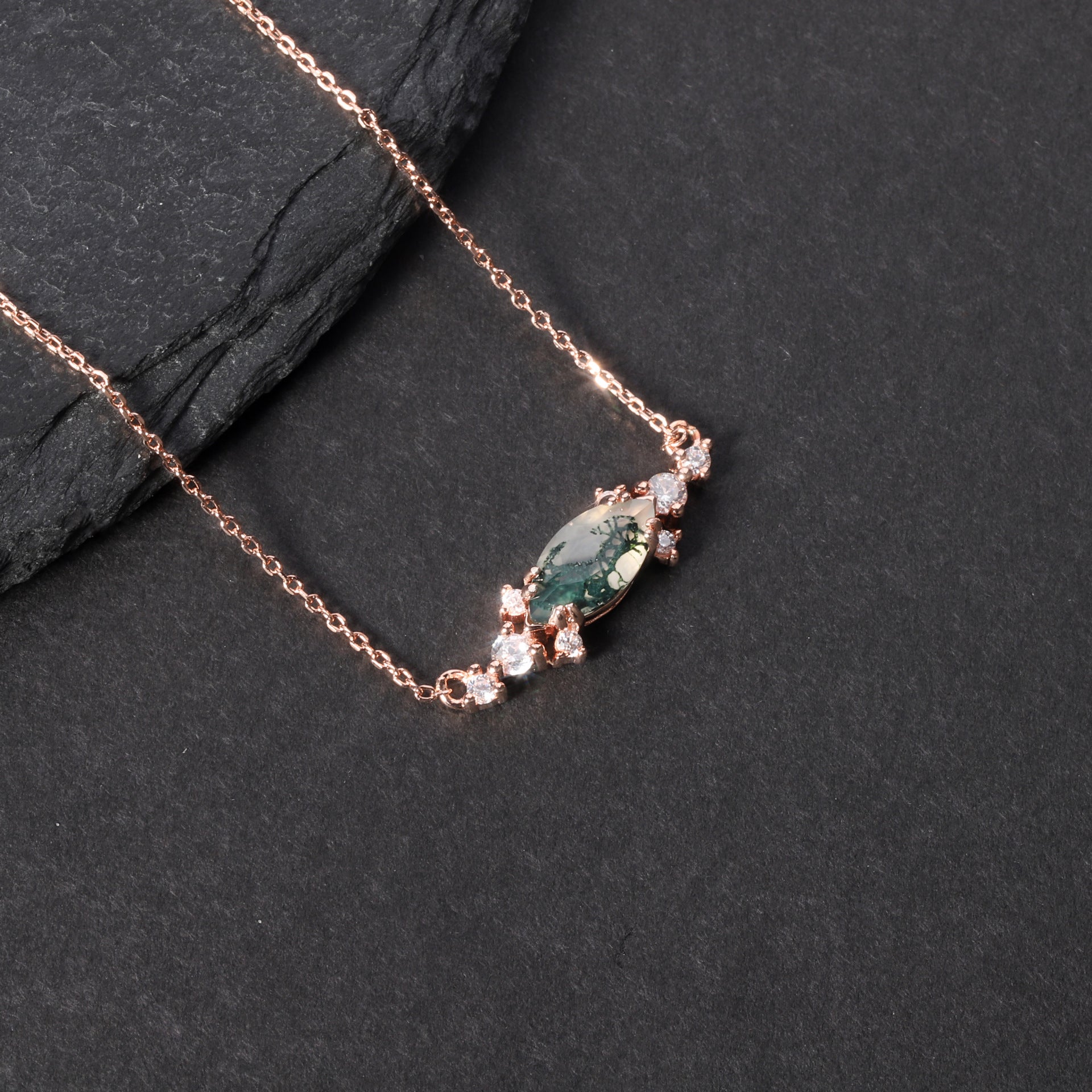 Indulge in timeless elegance with our 1.5ct Cluster Vintage Marquise Cut Moss Agate Necklace. Featuring a stunning marquise cut moss agate stone set in a delicate cluster, this necklace exudes vintage charm. Elevate any outfit and make a statement with this beautiful piece.
