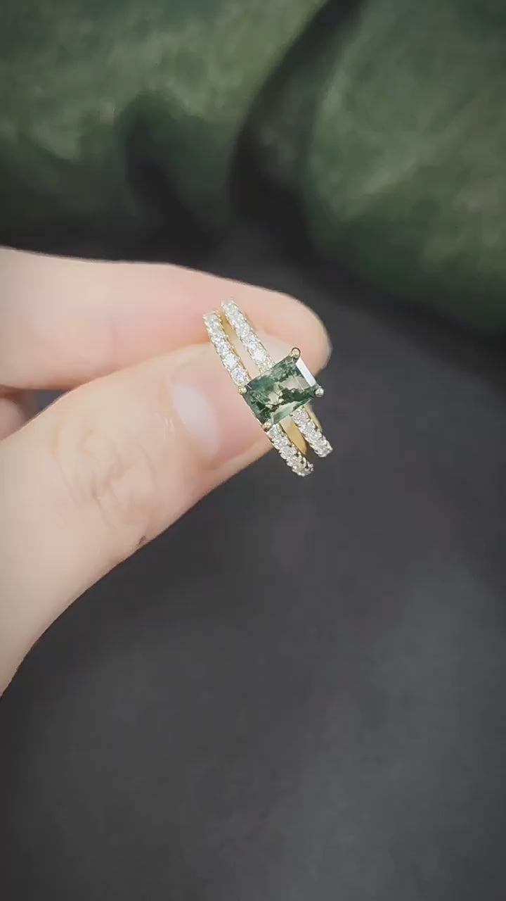 Unleash the beauty of nature with our stunning Emerald Cut Moss Agate Engagement Ring Set! Featuring a unique emerald cut design and crafted from ethically sourced moss agate, this 2-piece set exudes elegance and sophistication. Perfect for the eco-conscious couple looking for a one-of-a-kind engagement ring!