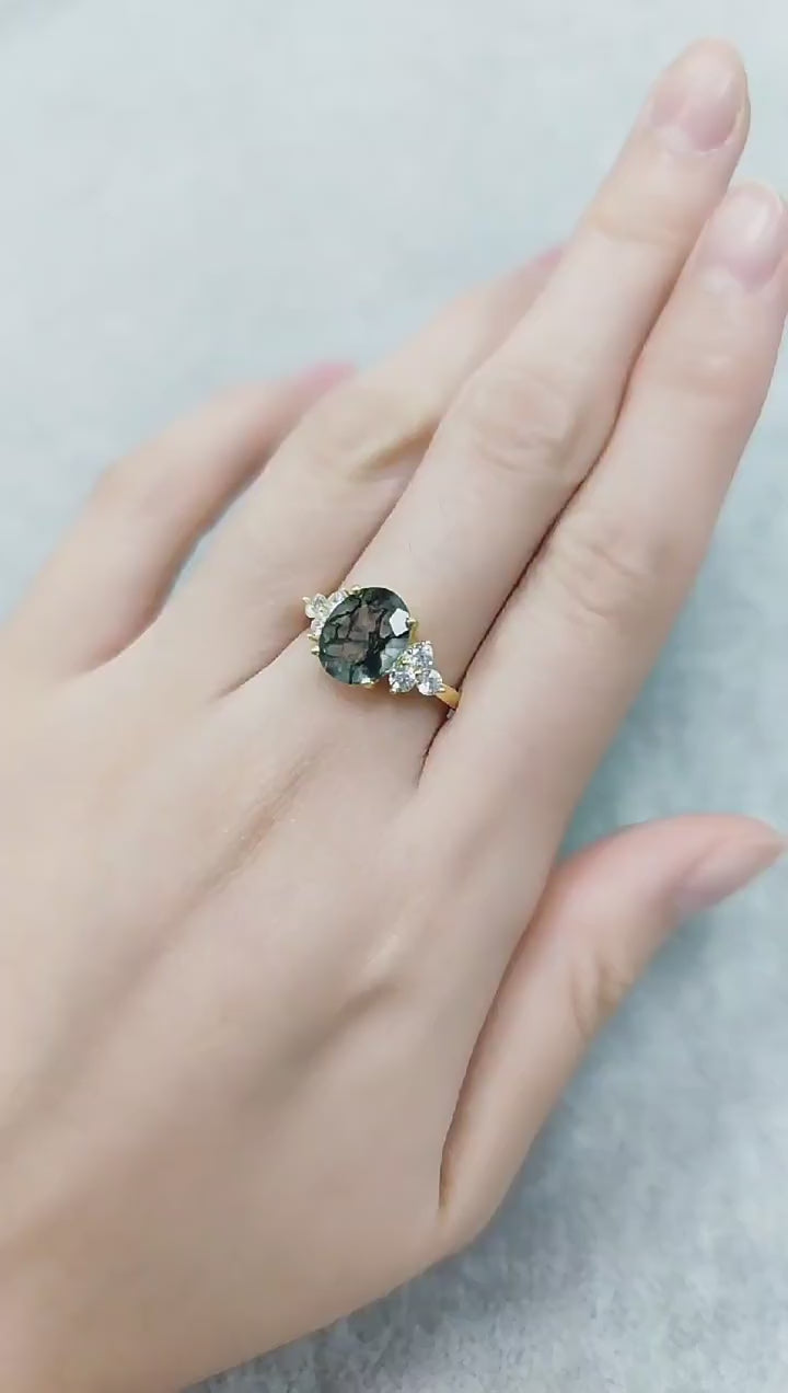 Elevate your love with our Oval Classic Moss Agate Cluster Engagement Ring. This timeless piece boasts a stunning oval-shaped moss agate stone, surrounded by a cluster of smaller gems. The unique combination of colors and textures creates a truly one-of-a-kind ring that will be cherished for years to come. Make a statement and capture the beauty of nature in every moment.