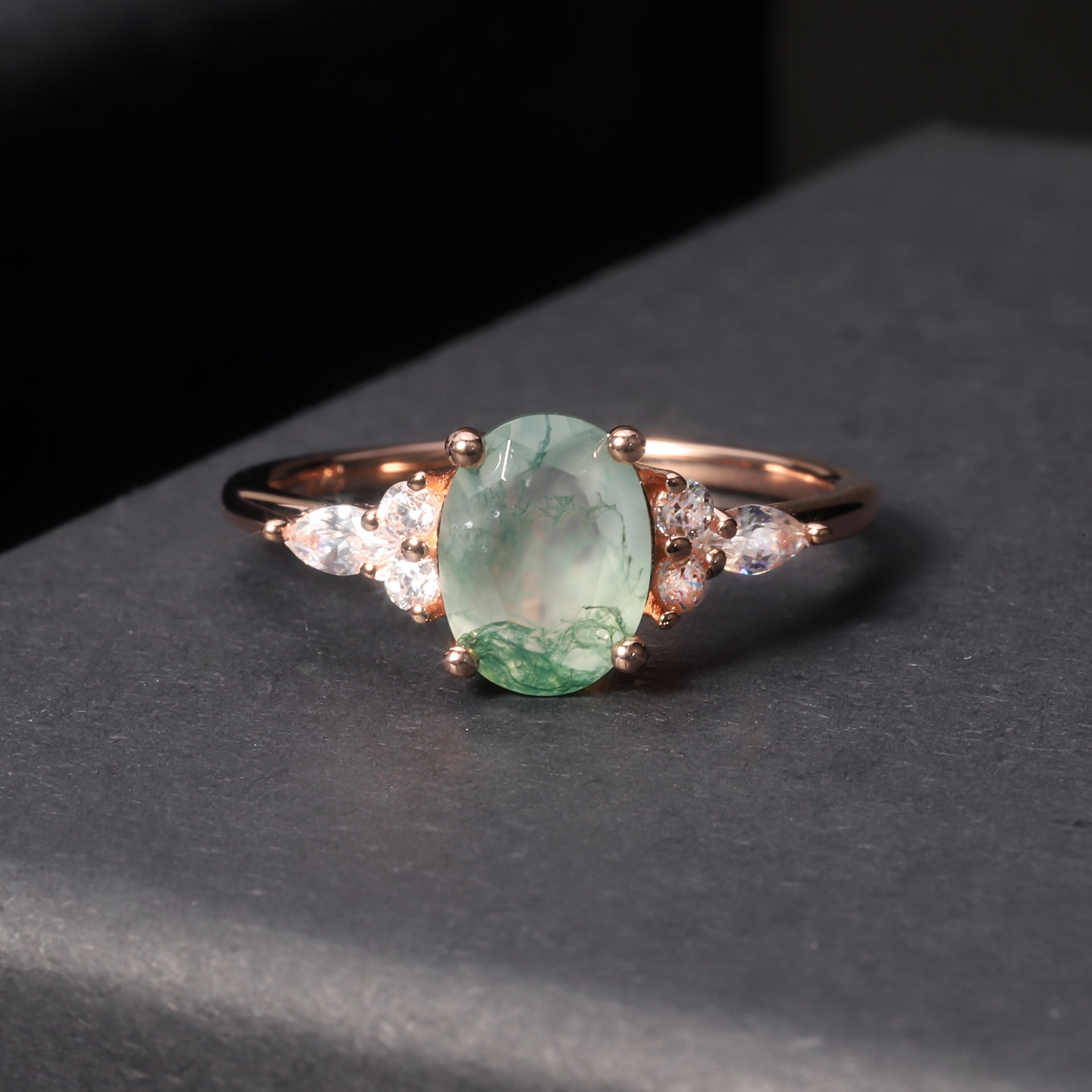 Unleash the timeless beauty of our Oval Cut Vintage Cluster Moss Agate Engagement Ring. With its unique oval cut and captivating cluster design, this ring is sure to make a statement. Made with genuine moss agate, it offers a one-of-a-kind appeal that will stand the test of time. Perfect for the one you love!