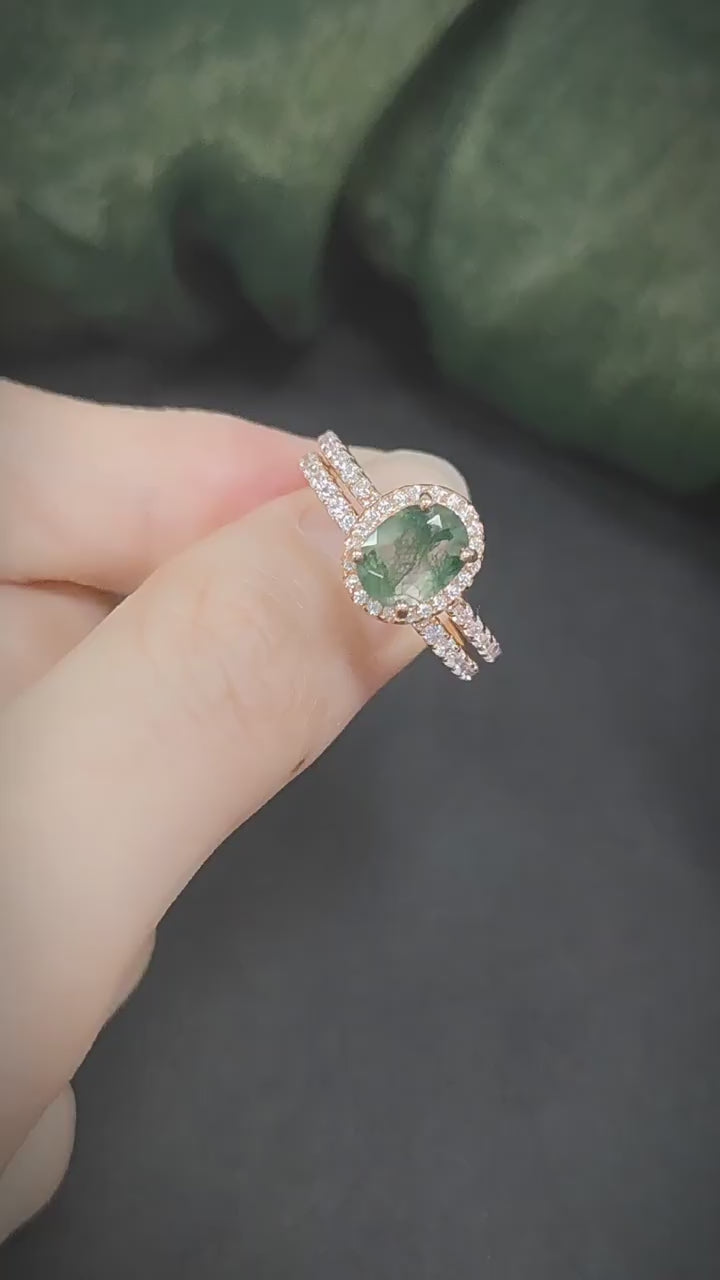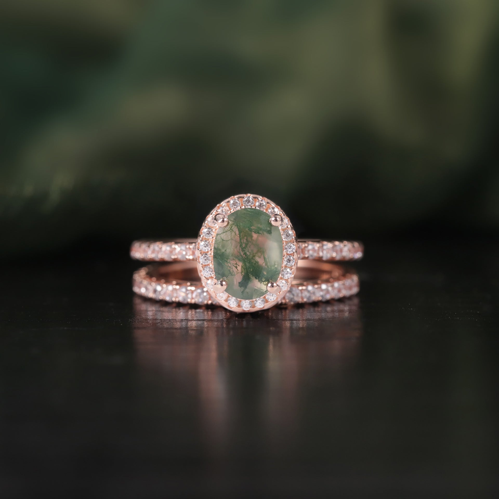 Oval Halo Zircon Pave Moss Agate Classic Engagement Ring Set 2pcs