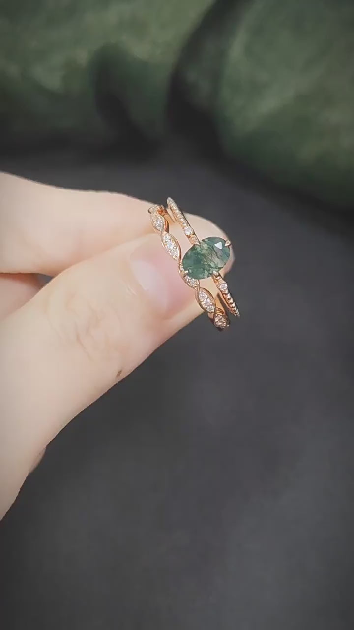 Oval Moss Agate Engagement Ring Sets 2pcs