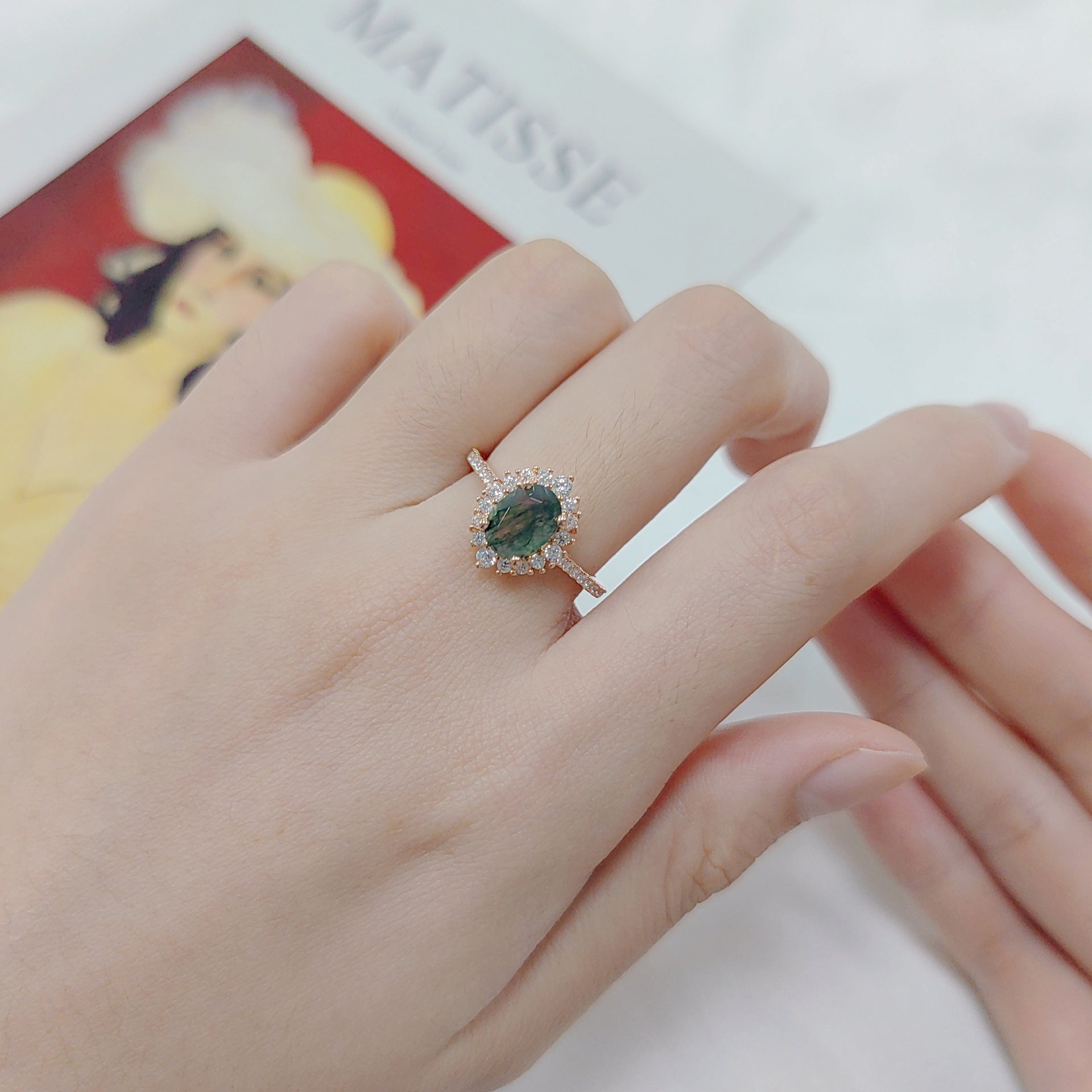 Oval Shaped Vintage Moss Agate Halo Engagement Ring