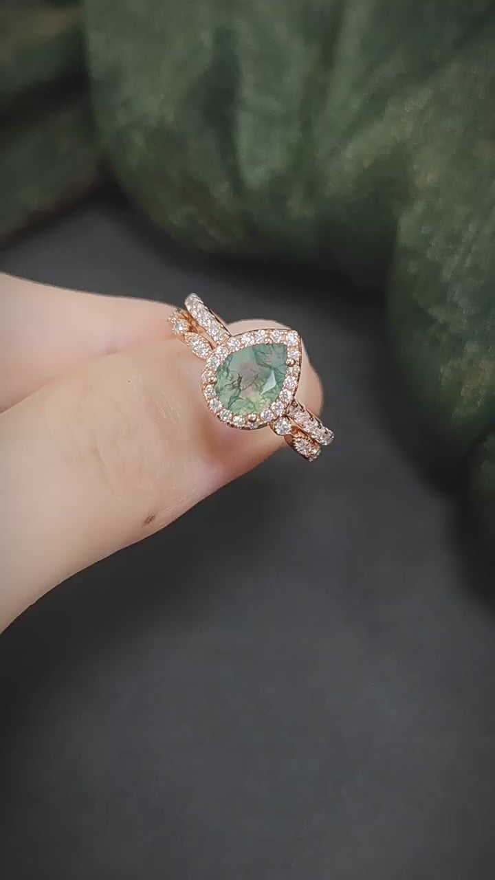 Pear Shape Halo Moss Agate Stacking Ring Set 2pcs