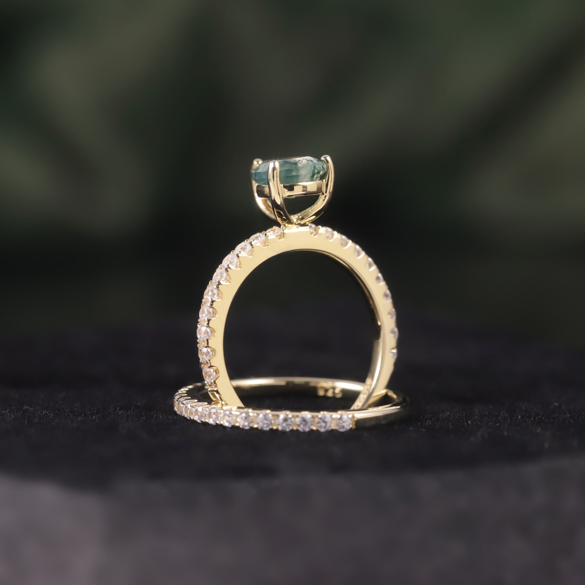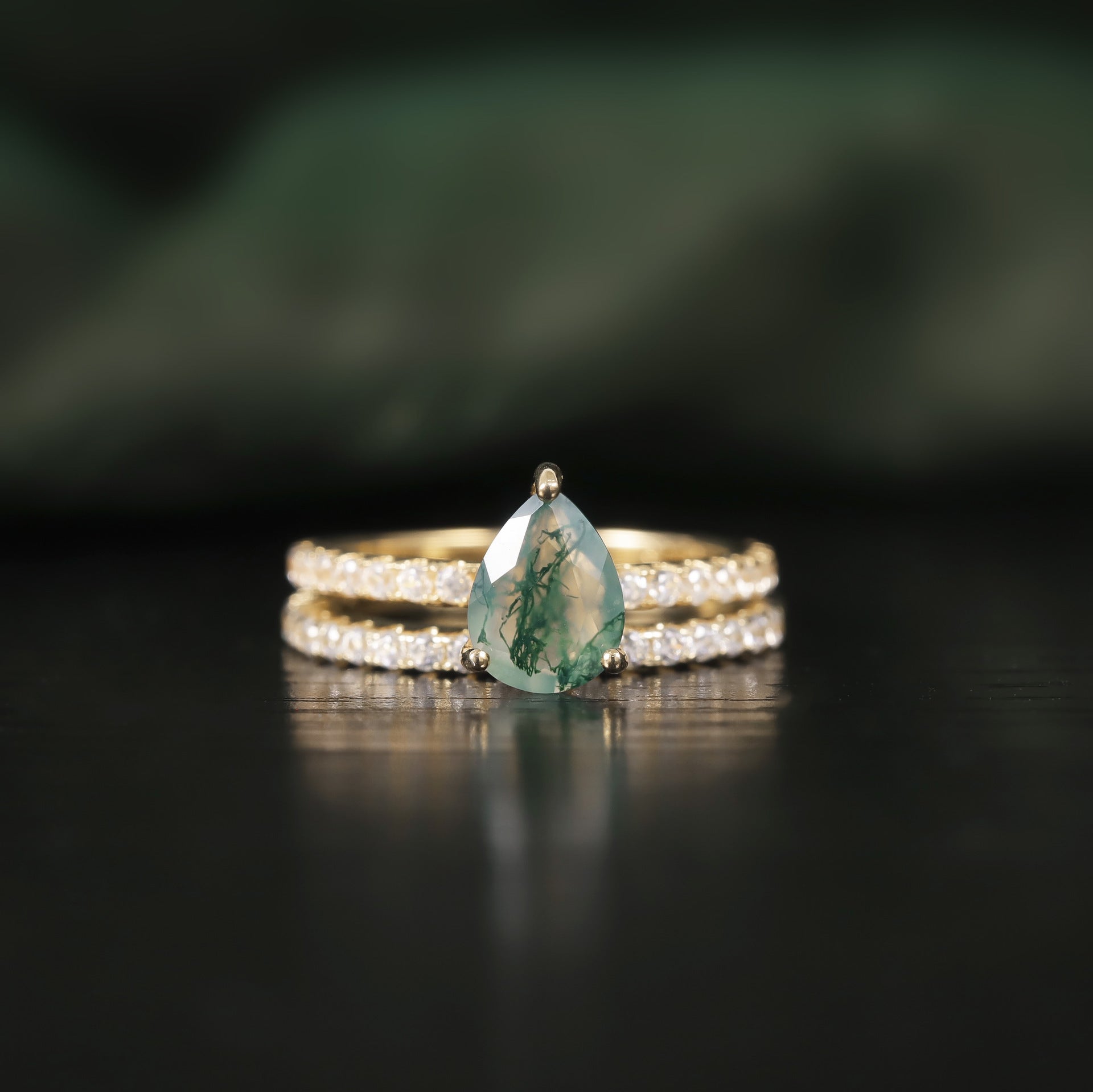 Pear Shaped Moss Agate Engagement Classic Solitaire Ring Set 2pcs